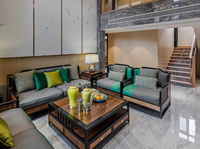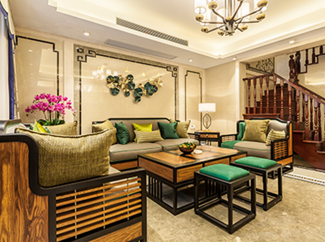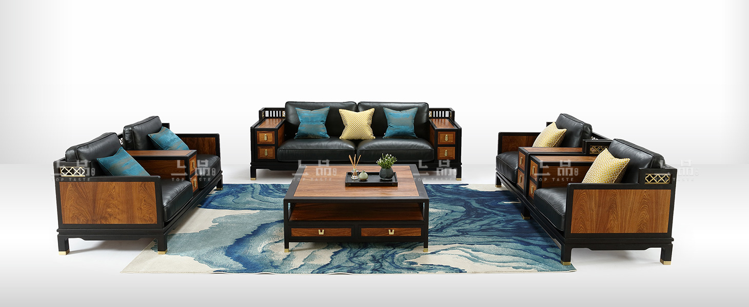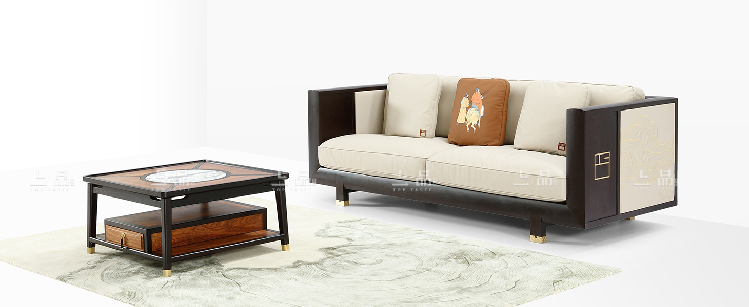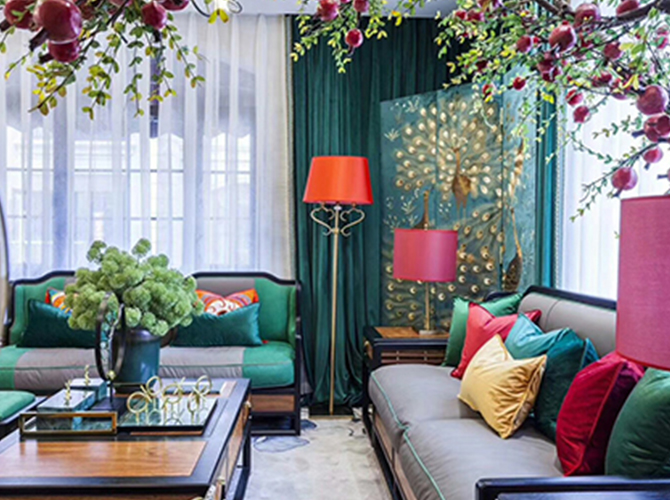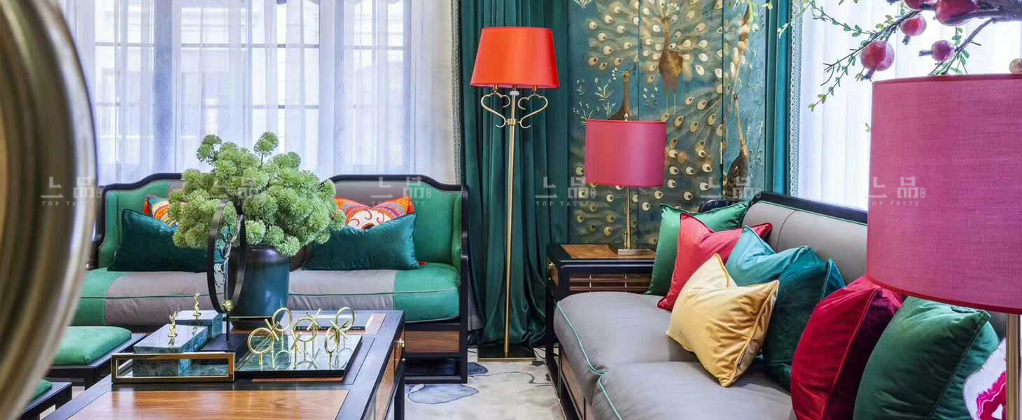 摒弃繁复花哨的装饰,以简练而满实的造型彰显大气与雍容。黑酸枝框架勾勒出江南园林般简约的立面和细腻的线条,棉麻布软包带来大自然的清新气息,浓烈的色彩演绎着满园的姹紫嫣红。